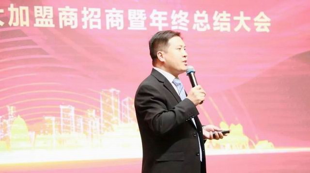 王学斌***总裁对大会发表致辞,对莅临大会的各位嘉宾、加盟商朋友表示欢迎,并从企业、加盟商发展及规划方面进行分享,并表示,愿与各位加盟商朋友携手共创辉煌。